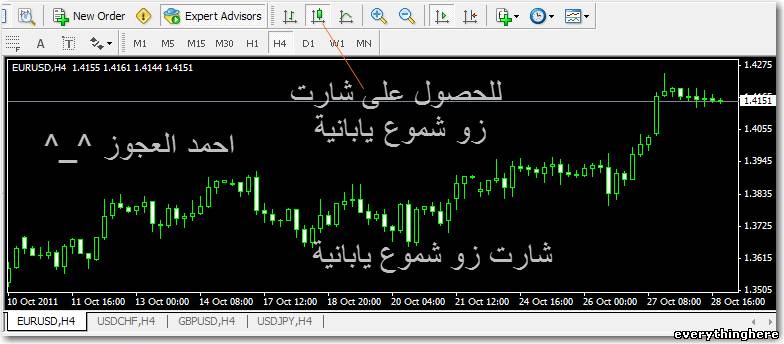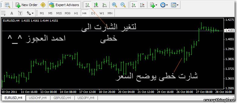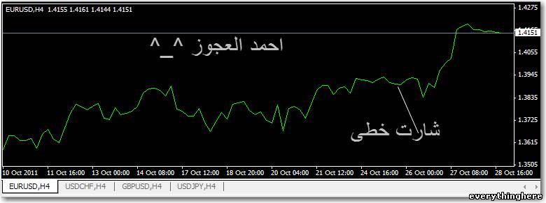 هو عبارة عن مخطط رسم بيانى يبين مسار تحرك الزوج حيث يلقى التريدر نظرة على هذا الرسم البيانى وباستخدام تقنيات التحليل الفنى يستيطع توقع مسار الزوج وعلى اساس هذا التوقع سيتخذ التريدر قرراته سواء بالبيع او بالشراء او الانتظار حتى يحين وقت احدهما . ويتم الحصول على هذه الرسوم البيانيه من خلال برنامج التداول الخاص بشركات الوساطه حيث تقوم هذه البرامج على ايصال حركه العملات اولا بأول على شكل رسوم بيانيه تجعل متابعتها سهله جدا . أشكال التعبير عن حركة السعر هناك 3 أساليب للتعبير عن حركة سعر العملة هم الأكثر استخداماً بين كافة المتاجرين في مختلف أنحاء العالم وفي مختلف أنواع البورصات والأسواق المالية : الرسم البياني الخطي Liner chart الرسم البياني ذوالقضبان Bars chart الرسم البياني ذو الشموع اليابانية Japanese candle stick chart يمكن بواسطة برنامج الرسوم البيانية فى منصة التداول أن تنتقل من أي أسلوب لآخر بضغطة زر فمثلاً يمكنك أن تراقب سعر عملة ما باستخدام الرسم البياني ذو القضبان ثم تنتقل لمراقبة السعر باستخدام الرسم البياني ذو الشموع اليابانية بضغطة زر واحدة الرسم البياني الخطي Liner chart وهو الرسم البياني الذي يعبر فية عن سعر العملة على شكل خط تمثل كل نقطة سعر إغلاق العملة لكل فترة زمنية . يعتبر أسلوب الرسم البياني الخطي هو أقل أنواع الرسوم البيانية استخداماً حيث يستأثر النوعان الآخران على اهتمام أغلب المتاجرين لأن النوعين الآخرين يعطيان قدر أكبر وأدق وأوضح من المعلومات للمتاجر .