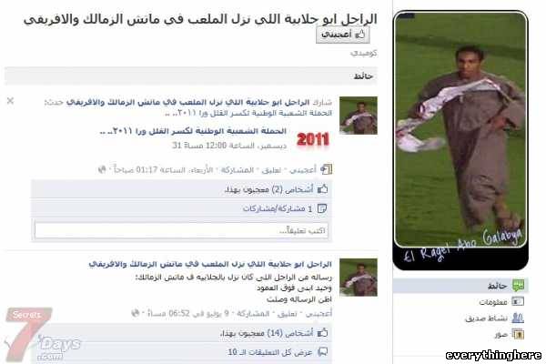 ذلك الشاب الذى كان يرتدى الجلباب ونزل مع مشجعى الزمالك لأرض الملعب عندما إقتحموا الملعب أثناء مباراة الزمالك والإفريقى التونسى فى بطولة إفريقيا وبالرغم الإساء الكبيرة التى تعرض لها الأمن المصرى بعدم قدرته على حماية مباراة كرة قدم إلا أن صفحات الفيسبوك الساخرة لم تلتفت لذلك وخرجت عشرات الصفحات للراجل أبو جلابية